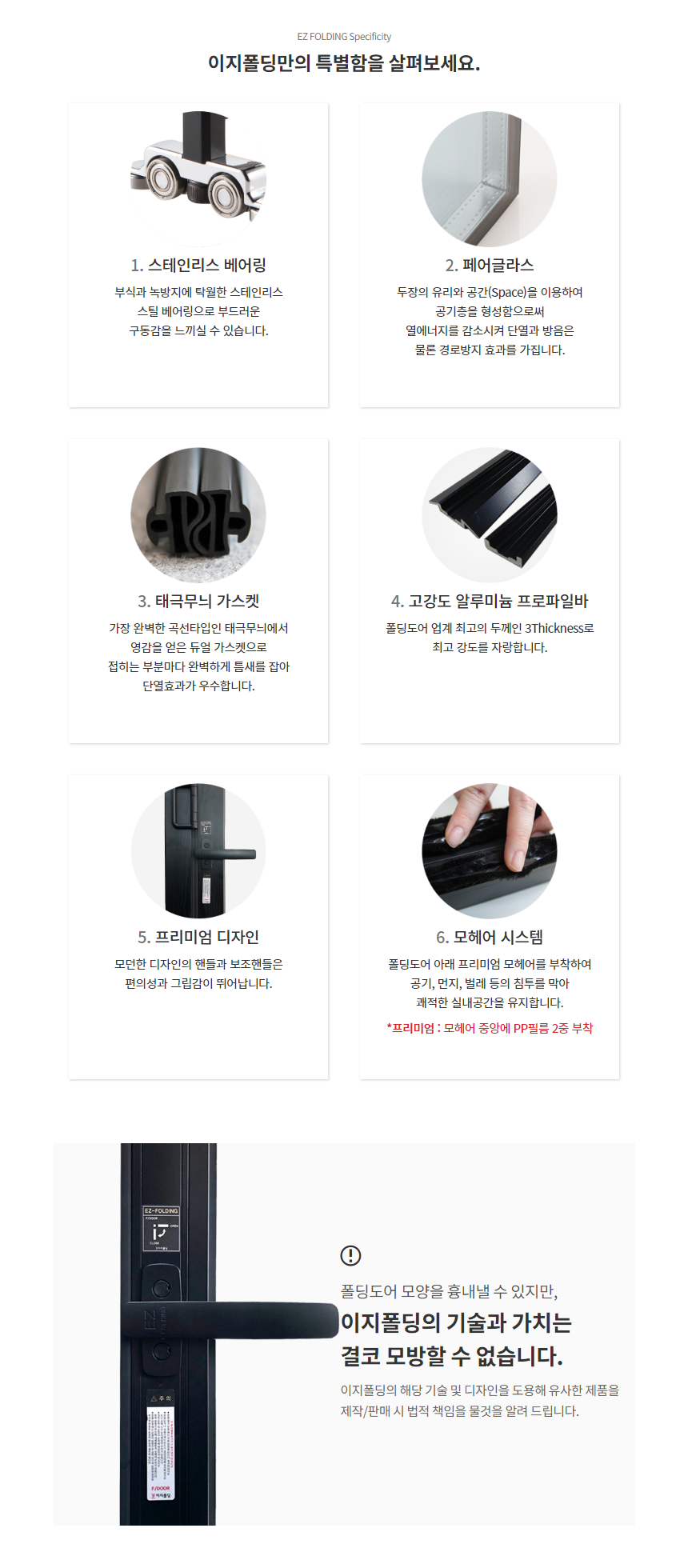 EPDM 재질의 듀얼 가스케인 '태극무늬 가스켓'은 도어와 도아 사이 틈새를 완벽하게 차단하며, 방음, 방풍, 단열 효과가 우수합니다. 또한 부드러운 태극무늬의 곡선 모양은 문을 밀착하여 닫더라도 손가락이 끼여 다치지 않도록 보호합니다.
